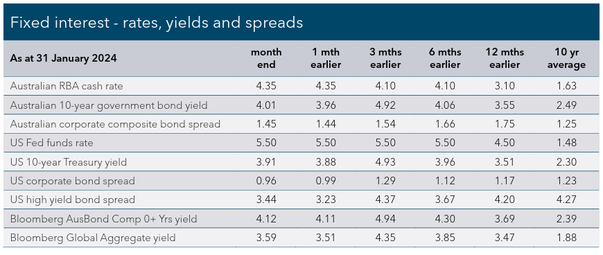 Fixed interest (bond) markets came down from last month’s heights to trade sideways in January. After declining rapidly in the last two months of 2023, bond yields edged marginally higher in January as investors recalibrated their monetary policy expectations in favour of a later pivot to rate cuts than what was the case a month ago. The Bloomberg AusBond Composite 0+ Yr Index edged +0.2% higher, while global bonds were moderately lower, with the Bloomberg Global Aggregate Bond Hedged Index slipping -0.3%.