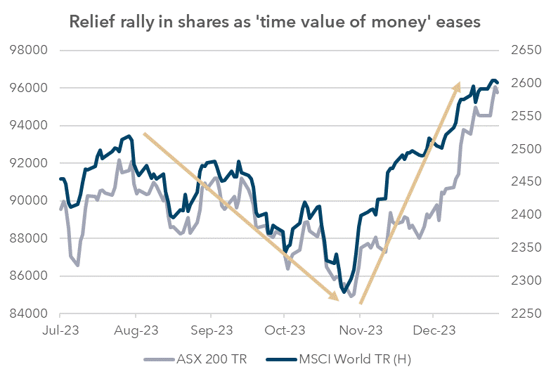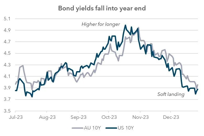 From the start of November, a sharp trend down in bond yields began. Triggered initially by a positive US inflation data print and extended in December by a surprisingly dovish statement by Fed Chair Jerome Powell, bond yields reverted to levels aligned with a ‘soft landing’ scenario. The year ended with US and Australian 10-year bond yields below 4.0%.