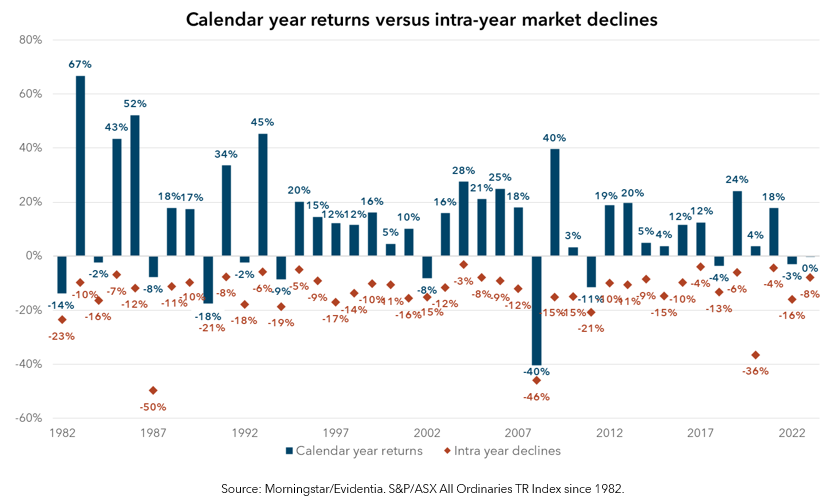 Market declines are more common than most people might think. The chart below compares calendar year returns and the largest intra-year declines in the Australian share market over the past 40 years. Although the end-of-calendar year returns have been overwhelmingly positive, it is rare the market will go through an entire year without experiencing a meaningful decline at some stage. While unsettling, short-term market volatility is inevitable and a normal part of investing. Disciplined, patient, and long-term focused investors understand this and know that over time, markets always recover and go onto post gains.