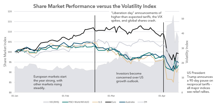International shares delivered mixed results, with US markets rebounding late in the month on stronger earnings and the tariff pause. Europe gained on solid industrial data, while emerging markets lagged due to weak Chinese growth and currency volatility.