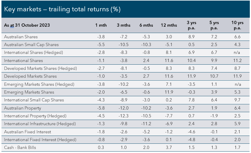 Rising bond yields again weighed on the interest rate-sensitive listed property sector. The local S&P/ASX 200 A-REIT Index followed a poor September, dropping another -5.8% in October. Global property was also weaker, with the FTSE EPRA Nareit Developed Index (Hedged) falling -4.5%. Although bond yields may be close to peaking, the high cost of capital (borrowing) will continue to impact earnings growth and the ability of listed property companies to grow via developments and acquisitions. Global listed infrastructure posted a negative monthly return with the FTSE Global Core Infrastructure 50/50 (Hedged) Index down -1.3% but outperformed international shares by some margin, with investors attracted to the inflation-hedge characteristics of the asset class.